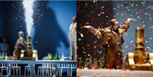 Стол накрывается винами и соблазнительной пищей, но ужин не состоится. Появляется какое-то странное маленькое существо в комбинезончике и в очках наподобие летуна эпохи начала воздухоплавания, также в программке не обозначенное и как бы мистическое. Оно расталкивает яства на столе и ставит вертикально подозрительную пушечку с двумя приделами по бокам. Пушка мощно выстреливает разноцветным дождем конфетти, засыпая всю сцену. Долгожданный ужин становится неактуальным, стол убирают вместе с нетронутыми блюдами. Конфетти остается на сцене всё остальное время, дамы разметают его подолами роскошных платьев, подбрасывают вверх руками, подчеркивая свое пристрастие к этой радости жизни. Что означают эти чудеса?