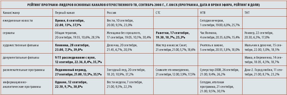 Вообще, заметный успех "Первого канала" в сентябре (средняя доля телесмотрения выше, чем у ближайшего преследователя - телеканала "Россия", почти на 6%) во многом предопределен проектами не новыми, но любимыми старыми. Если суббота - день фигурного катания, то по воскресеньям зрители стабильно наблюдают ухищрения в спортивном и творческом самовыражении участников проектов "Большие гонки" и "Минута славы".