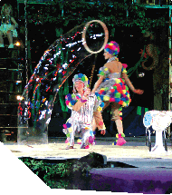 Велоэквилибрист Александр Воронцов сначала зарабатывал на жизнь только ногами. Но, трудясь в коллективе, где все "штатные водяные", необходимо было как-то задействовать и H2O вокруг. Так родился номер с мыльными пузырями.