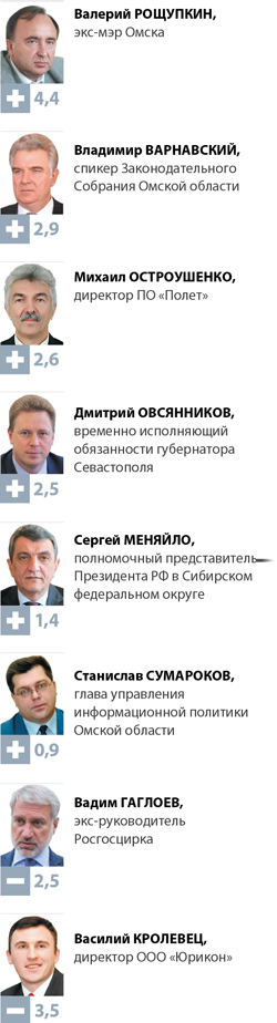 Временно исполняющим обязанности губернатора Севастополя стал омич Дмитрий Овсянников. Ранее он работал в Приволжье – занимал должность заместителя главы «Объединённой двигателестроительной корпорации», а в 2014 году возглавил департамент региональной промышленной политики в федеральном министерстве промышленности и торговли. Эксперты «БК» желают успеха нашему земляку. У Овсянникова +2,5 балла.
