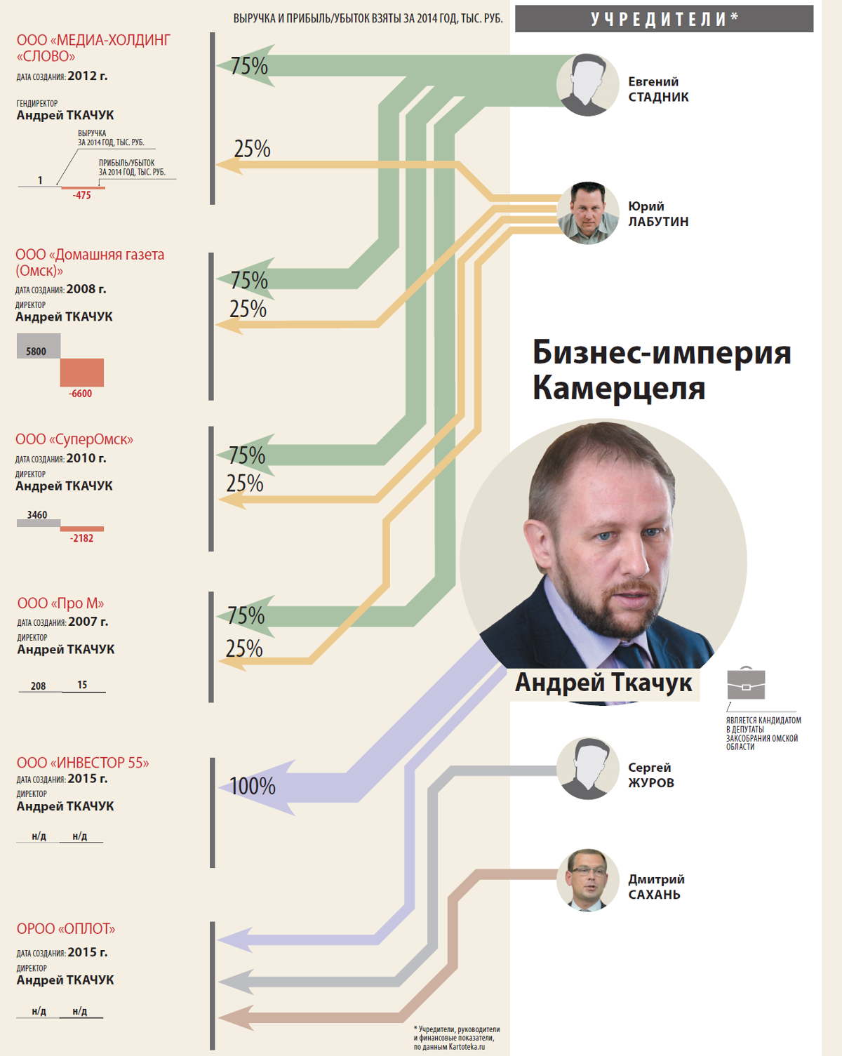 В медиахолдинг ООО «Слово», управляемый Дмитрием Павловым (а значит и Виктором Камерцелем), входят «СуперОмск», «Омск-300», «Домашняя газета». Курирующий редакционную политику этих изданий политтехнолог Андрей Ткачук заработал себе скандальную репутацию, пытаясь попеременно противостоять всем СМИ в городе, дерзя облправительству, мэрии и публикуя компромат на местные политические силы. Отличительная черта этих материалов – большое количество инсайдов с характерным изложением на грани хамства.