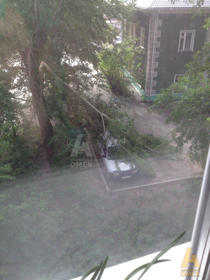 В Нефтяниках на улице 20 Партсъезда вывернутый с корнем тополь буквально расплющил «десятку» во дворе дома (фото: «Аварийный Омск»)