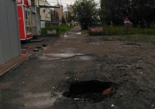 Так, в Кировском округе, на тротуаре рядом с киосками по бульвару Архитекторов, 5/1 А провалился асфальт. Долгое время там была небольшая ямка, вчера после ливня яма стала огромной, подмыло грунт под тротуаром и скоро обвалится ещё, сетуют в соцсетях.