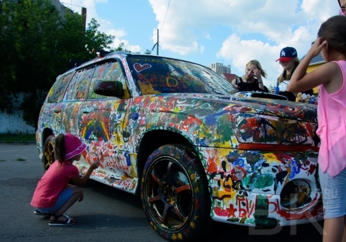Белый автомобиль Subaru отдали «в жертву» попробовавшим себя в роли автомаляров детям и взрослым в минувшие выходные. Они взялись за него и гуашь в День Омича, который совпал с фестивалем уличного искусства «Стеннограффия», в рамках которого и предоставили машину «народным художникам».