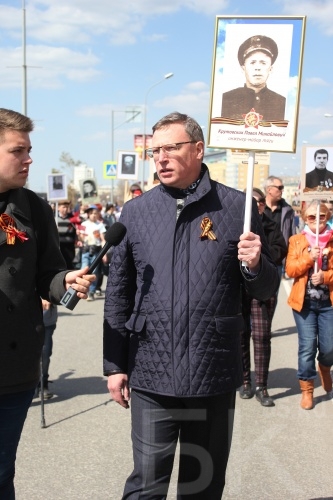Врио губернатора Омской области Александр Бурков отправился на акцию с портретом деда по материнской линии Павла Михайловича Крутовских. Он был призван на фронт с первых дней войны и до 1943 года служил в пехоте под Москвой. После того, как вышел указ о возвращении железнодорожников к работе по профилю, Павел Михайлович, имея удостоверение машиниста паровоза, отправился на Урал. До конца войны он возил на паровозе раненых, оборудование, снаряды. Он окончил войну со званием личного состава железнодорожного транспорта – инженер-майор тяги.