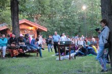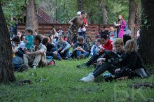 Некоторые устроились на предоставленные организаторами пластиковые стулья, но большинство расположились на травке: на предусмотрительно принесенных одеялах, покрывалах, ковриках. А кто-то и просто непосредственно на лужайке между деревьями.