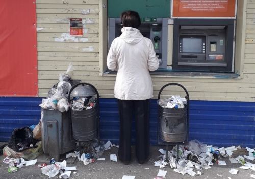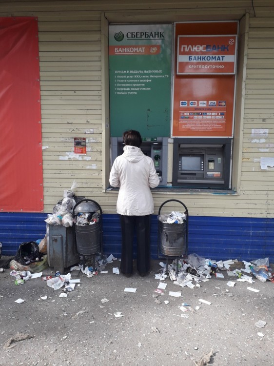 На фото видно, что к банкомату невозможно подойти – на земле валяется разнообразный мусор. Хотя рядом стоят урны. Убирать беспорядок никто не торопится.