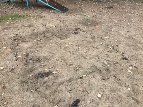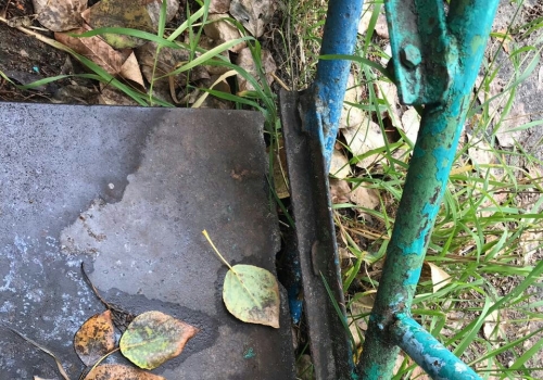 На фото видно, что площадка очень старая, у домиков и колес облезла краска, на горке нет ступенек, от песочницы и вовсе остался только след на земле.