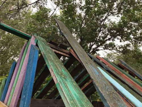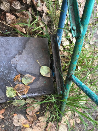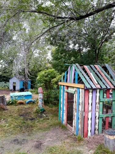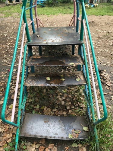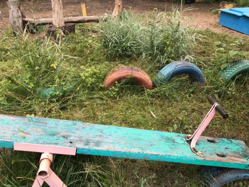 На фото видно, что площадка очень старая, у домиков и колес облезла краска, на горке нет ступенек, от песочницы и вовсе остался только след на земле.