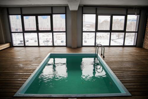 Открылся бассейн с зоной для лежаков, где можно полежать и расслабиться после парения. Огромные витражные раздвижные окна дают реальное ощущение единения с природой.