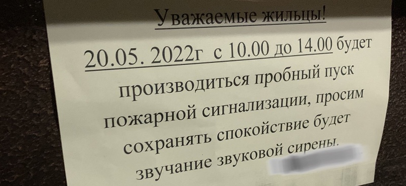«Уважаемые жильцы! 20.05.2022 будет производиться пробный пуск пожарной сигнализации, просим сохранять спокойствие, будет звучание звуковой сирены», — говорится в обращении к жильцам от управляющей компании.