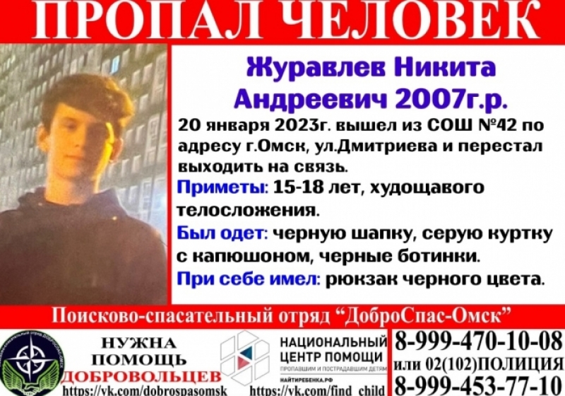 Приметы пропавшего школьника: на вид 15-18 лет, худощавого телосложения. В момент ухода был одет в черную шапку, серую куртку с капюшоном, обут в черные ботинки. С собой был рюкзак черного цвета, сообщил «Новый Омск».