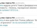 В официальном микроблоге посольства появился пост, адресованный Ирине Родниной: «Мудрая цитата Томаса Джефферсона: «Нетерпимость — болезнь, порожденная невежеством».