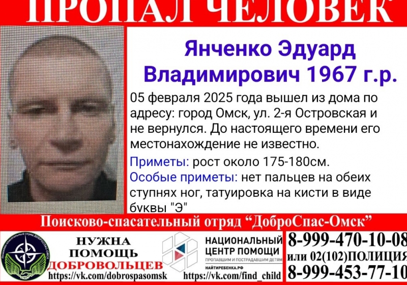 Отряд «Доброспас-Омск» опубликовал объявление об исчезновении мужчины в Кировском округе. 58-летний Эдуард Янченко 5 февраля 2025 года вышел из дома на улице 2-я Островская и пропал.