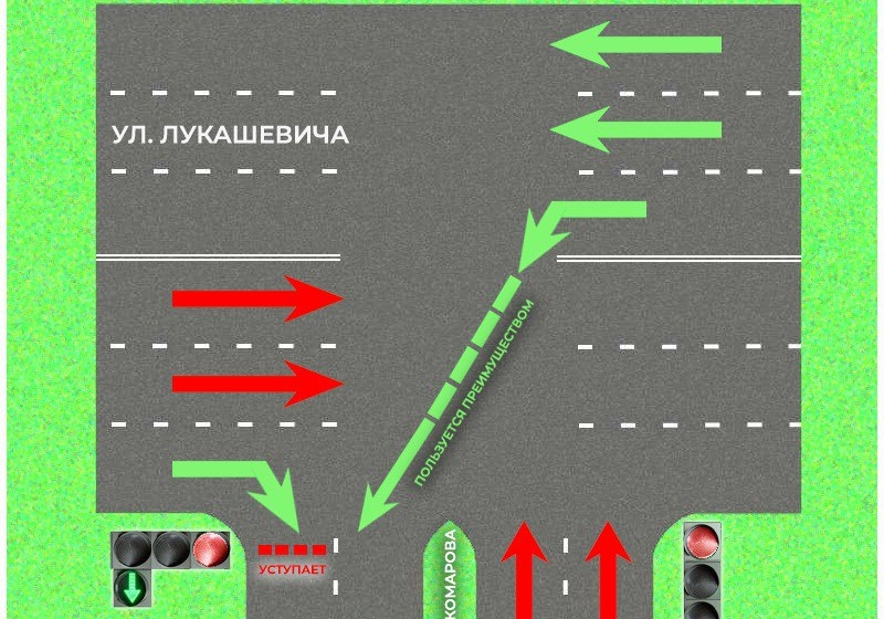 - по улице Лукашевича с правым поворотом на проспект Комарова (на разрешающий сигнал дополнительной секции светофора)
