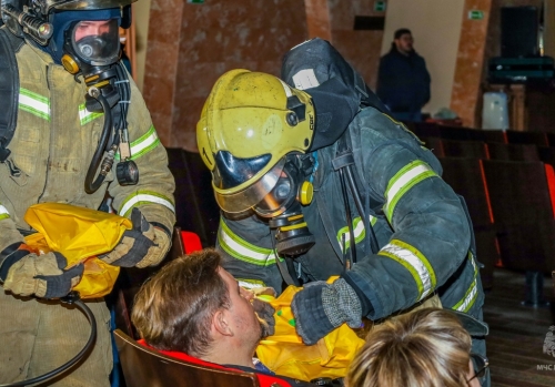 На сцене произошло условное возгорание. Дымовую завесу в зале создал дымогенератор. Пожарным предстояло найти условных пострадавших, провести эвакуацию и ликвидировать открытое горение. Дополнительная вводная: спасти звено газодымозащитников и ликвидировать возгорание на крыше здания.