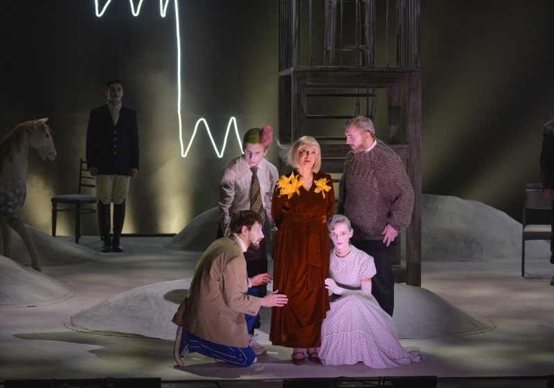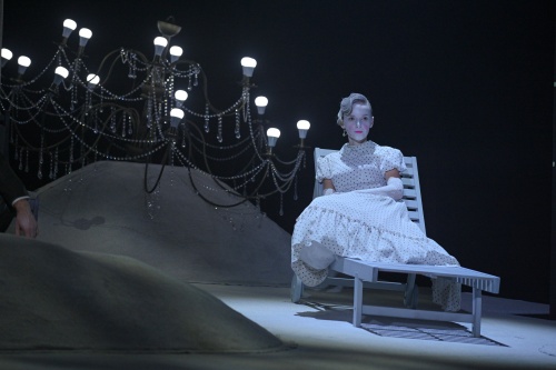 Все персонажи спектакля объединены чувством одиночества и внутреннего разлада, разъедающего их изнутри, подобно ржавчине. Они напоминают марионеток с механическими, заданными извне, навязанными движениями. Самая трогательная из них — Нина (актриса Кристина Лапшина) в своём кисейном платьице в горошек, ажурных перчаточках и чулочках. Вырвавшийся из её груди резкий возглас, похожий на крик чайки, заставил вспомнить другую Нину — Заречную. Чеховская чайка будто бы случайно ненадолго залетела в распахнутое окно и тут же выскользнула наружу. Но если Нина Заречная с её кровоточащей душевной раной вызывает неподдельное щемящее чувство, то наша Нина — как бы принуждает нас к сочувствию. Её жизненная драма, в которой нашли место и отчаяние из-за бегства любимого человека, и попытка суицида, нивелируется внешним обликом героини: тщательно причёсанная, с кукольным румянцем на щеках, она воспринимается скорее, как сверкающая глянцем картинка, нежели как женщина из плоти и крови. Нина живёт в ожидании мастера. Но где он — этот современный Тригорин? Исписался, сломался под натиском житейских бурь, подобно Жаркову? Или, залихватски пришпорив коня, несётся к новым, неизведанным горизонтам, подобно Лёве Груздеву (артист Степан Дворянкин)? Дуэт Кристины Лапшиной и Степана Дворянкина сквозит различными эмоционально-смысловыми коннотациями: они одновременно и чужие друг для друга люди, и вместе с тем их тянет друг к другу, словно магнитом (в сцене с поцелуем это проявляется особенно ярко). Оба — трудные партнёры. Нина в исполнении Кристины Лапшиной — хрупка и ранима. Она словно драгоценная статуэтка, которую, из страха разбить, ставишь от греха подальше в шкаф на полку, закрываешь на ключ и лишь временами на почтительном расстоянии, через стекло, позволяешь себе полюбоваться на неё. Лёва в исполнении Степана Дворянкина — типичный постерный мальчик, каждый жест которого — постановочный, фальшивый.
