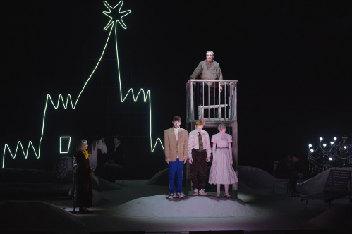 В постановке Ф. Гуревича пространство, в котором обитают герои, — это ограниченный, замкнутый круг, из которого невозможно вырваться. Сценография (художник Ольга Суслова) строится на сочетании бытового и иллюзорного. Квартира из сталинской высотки воплощает эстетику пустыни, где, с одной стороны, всё достаточно условно и размыто, как во сне, а с другой, полно реалистических интерьерных деталей, к которым герои словно прикручены: Ким (актёр Артём Кукушкин) — к металлической кровати с панцирной сеткой, с которой он на протяжении всего действия практически не сходит, Нина (актриса Кристина Лапшина) — к деревянному шезлонгу. Персонажи спектакля напоминают островитян, разбросанных по холодной пустой планете и отгороженных друг от друга глыбами льда, временами пульсирующих всполохами магического северного сияния (художник по свету Павел Бабин). Ощущение будоражащего напряжения и тревожной потерянности подчёркивается музыкальными интонациями, в которых угадываются полузабытые, некогда популярные мелодии прежних лет. В этом абстрактном, абсолютно бездушном пространстве, бьются живые сердца героев — тех, кто застрял между настоящим и прошлым.
