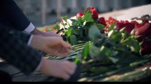 В момент возложения мальчик преклонил колено вместе с отцом, символизируя уважение к памяти о героях.