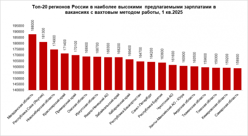 Медианная предлагаемая зарплата в вахтовых вакансиях в целом по России составила в первом квартале 2025 года 154,5 тыс. рублей. Самые высокие зарплаты работодатели готовы платить вахтовикам в Магаданской области (188,0 тыс. руб. в среднем). Омская область по этому показателю оказалась на пятом месте. Здесь вахтовикам в среднем предлагают зарплату в 168,9 тыс. рублей.