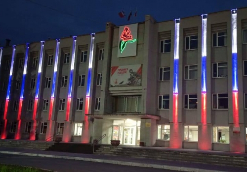 На фасаде администрации Октябрьского округа появилась новая архитектурная подсветка, выполненная из 42 светодиодных прожекторов. Каждый этаж здания подсвечен цветами российского флага, а в верхней части фасада размещена красная гвоздика — символ памяти, гордости, стойкости и надежды народа.