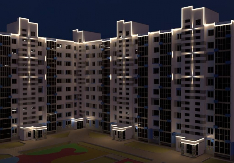 В дизайне фасада используется ночная подсветки. В дворовой территории установлены торшерные светильники, а по периметру здания — светодиодная лента, которая освещает фасад, козырьки входных групп и проходы.