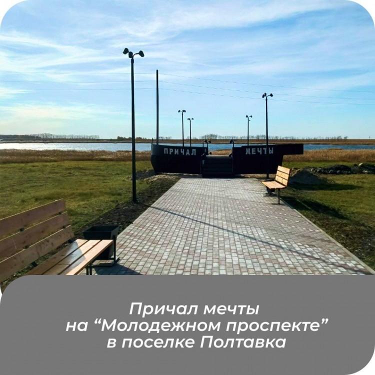 Полтавский район также представлен ярким проектом: в поселке Полтавка на берегу озера обустроена молодежная площадка «Причал Мечты» с сценой, подсветкой и зонами отдыха.