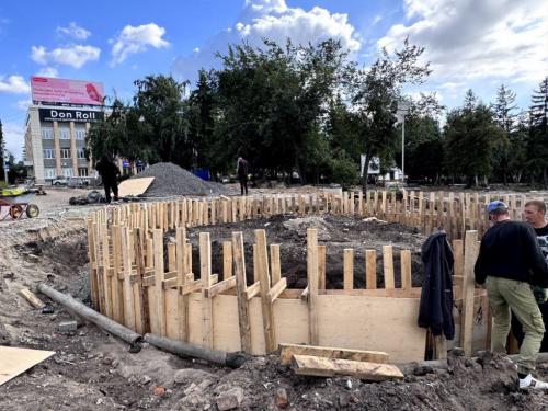 Здесь уже возвели опорную стену вдоль улицы Лермонтова, обустроили все коммуникации и разбили большую круглую клумбу рядом с остановкой «Площадь Ленина».
