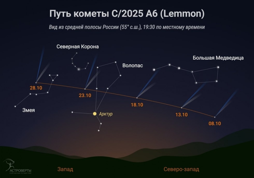 21 октября она пройдет на минимальном удалении от нас — около 89 млн км. Затем астрономическое тело направится в сторону Солнца, переходя на нашем небе в созвездие Волопаса, где ожидается максимум блеска.
