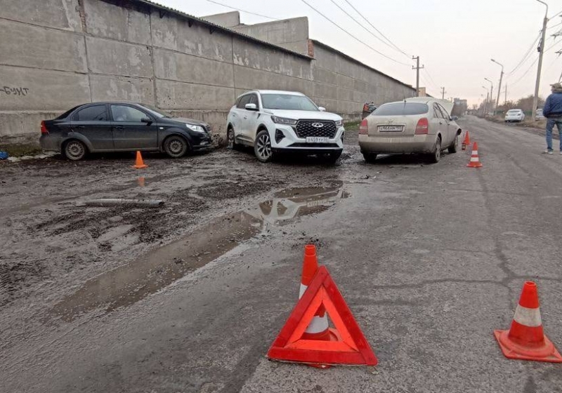 В районе дома № 3/2 по улице 1-й Казахстанской, судя по фото, в промзоне, произошло столкновение трех легковых автомобилей.