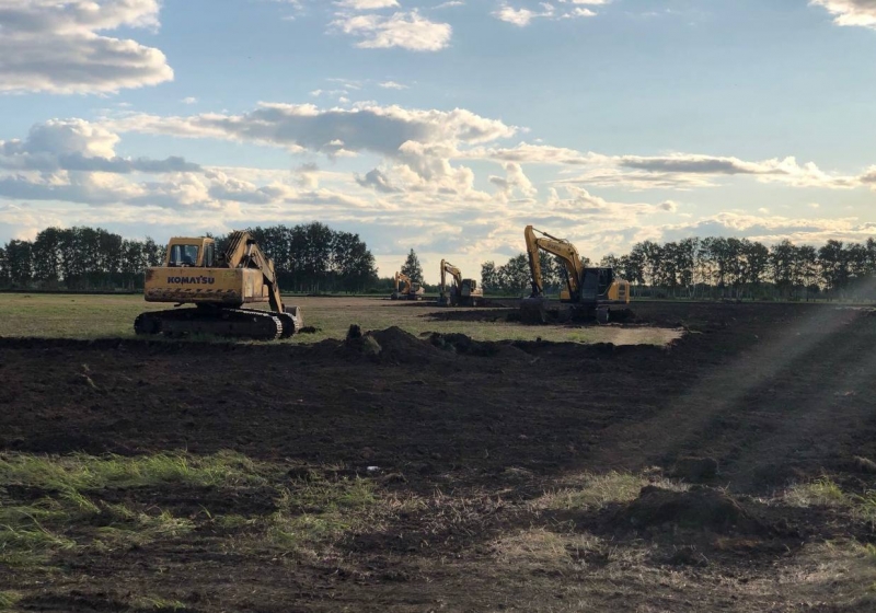 На данный момент на строительной площадке осуществляется доставка строительных материалов, монтаж винтовых свай для будущих теплиц, подключение земельных участков к инженерной инфраструктуре. Завершена геодезическая разбивка свайного поля для первой теплицы, продолжается монтаж свайных конструкций.