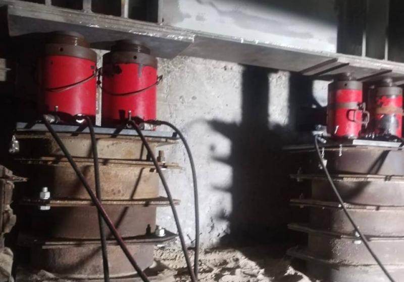 Процесс начался с подъема моста с помощью домкратов и его последующего опирания на специально подготовленные временные конструкции — металлические тумбы, заполненные бетоном. Данная операция стала возможной благодаря предварительному усилению главных балок пролетного строения и домкратных балок высокопрочным металлом. Это техническое решение, разработанное проектным институтом, является обязательным условием для безопасного переопирания моста.