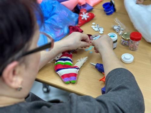 «О существовании объединения я узнала от своего координатора и, поскольку я творческий человек, заинтересовалась. Пришла, а здесь уже идет подготовка к Новому году. Это меня особенно вдохновило, ведь я родилась в канун праздника. Влилась в коллектив и включилась в процесс: предложила подготовить заготовки дома на швейной машинке, а на встрече всем вместе их набить. Так и сделали, участницы поделились тканью.