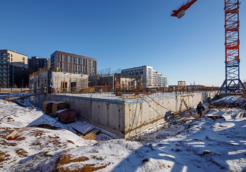 По данным на текущий момент, строители завершили ключевой подготовительный этап: выполнены земляные работы, сооружен цокольный этаж и готова чаша будущего плавательного бассейна. В настоящее время ведутся работы по возведению стен первого этажа и гидроизоляции цокольной части здания.