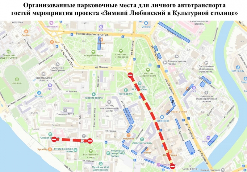 На схеме представлены точки для размещения личных автомобилей омичей-гостей новогодней ночи на территории «Омской крепости» и событийного проекта «Зимний Любинский», который продлится по 11 января.