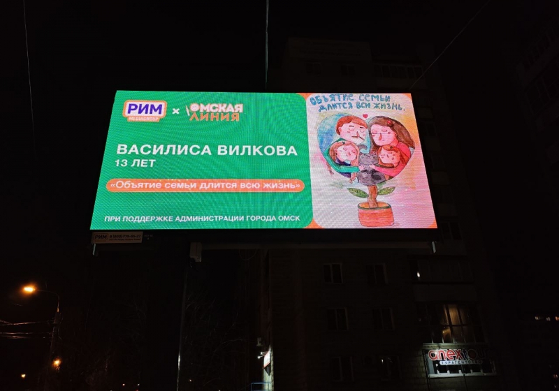 На улицах Омска появились работы юных художников — победителей городского конкурса социальной рекламы «Омская линия». Их эскизы, посвящённые семейным ценностям, взаимопомощи и межкультурному согласию, размещены на городских видеоэкранах при поддержке медиахолдинга «РИМ».