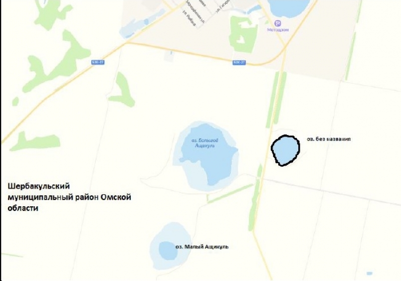 Озеро Сухое, не имеющее официального названия, расположено к югу от рабочего посёлка Шербакуль.