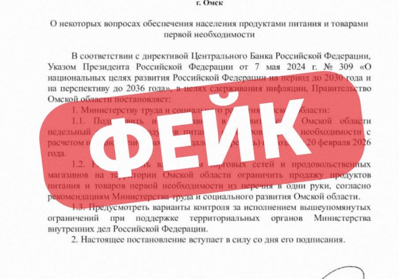 В фейковом документе утверждается, что Омской области собираются составить недельный перечень продуктов на одного человека и рекомендовать магазинам ограничить их продажу, а также организовать контроль за соблюдением этих мер. Всё это делается «в целях сдерживания инфляции».