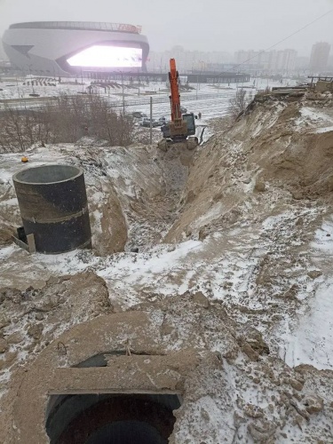 Работы по модернизации ливневой канализации также развернуты на подходах к объекту. Со стороны Левобережья строители сформировали котлован глубиной восемь метров для монтажа новых дождеприёмных и смотровых колодцев, а также трубопроводов.