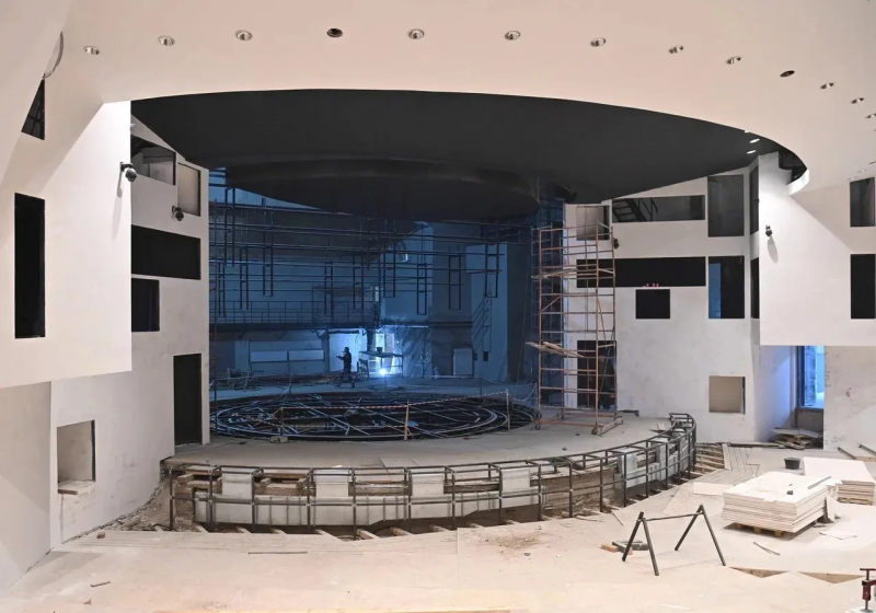 В настоящее время выполнена черновая отделка помещения сцены. Завершен монтаж конструкции барьеров сцены. Проведены подготовительные работы под декоративную штукатурку стен зрительного зала.