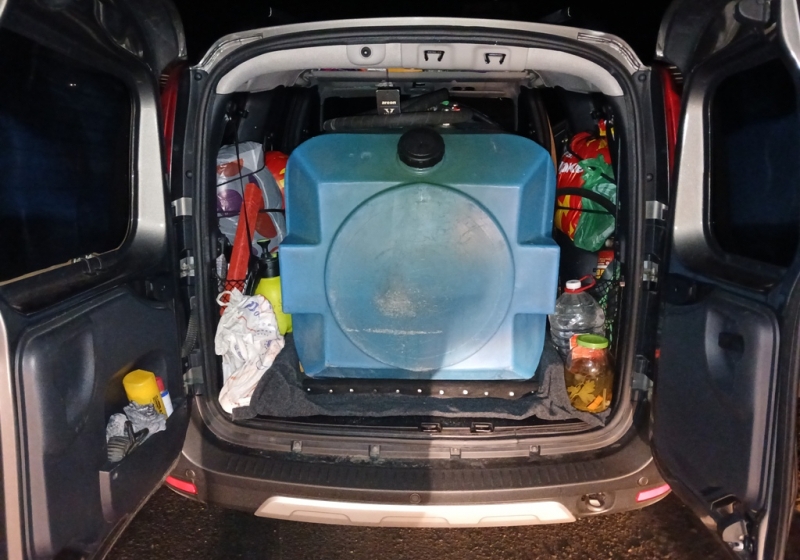 Полицейские следующей ночью задержали подозреваемого — 52-летнего жителя Ставропольского края — в момент выезда со стоянки. В салоне его автомобиля обнаружен наполовину заполненный пластиковый резервуар объемом 500 литров, установленный вместо заднего ряда сидений, шланги и погружной насос для перекачки жидкостей.