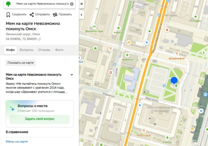 На омских картах уже появилось три мема, посвященных городу. Это мемы про метро, «Невозможно покинуть Омск», «Омская птица». К каждому из них прикреплены свои координаты. Например, мем «Невозможно покинуть Омск» ведет в сквер Привокзальный.