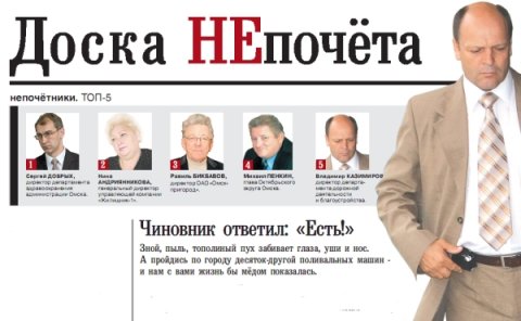 Сайт «БК55» продолжает публиковать анонсы рубрики «Доска НЕпочета» газеты «Ваш Ореол». На этой неделе в номинации «победил» директор департамента дорожной деятельности и благоустройства администрации города Омска Владимир Казимиров.