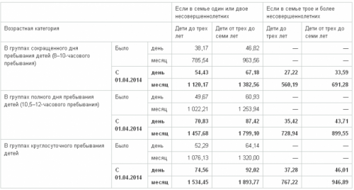 По новым расценкам родителям придется платить от 600 рублей (группы 8-10-часового пребывания для детей до трех лет из многодетных семей) до 2000 рублей (группы круглосуточного пребывания для детей от 3 до 7 лет).