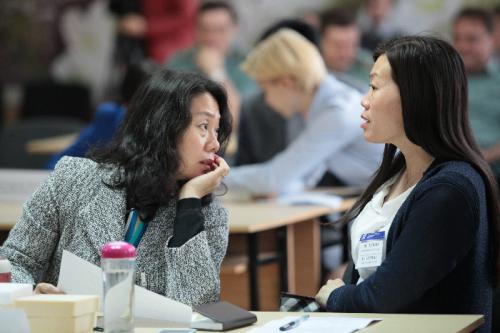 Руководитель представительства МИД в Омске Олег Белоглазов оживленно беседует с директором департамента экономической политики Гульнар Айтхожиной.