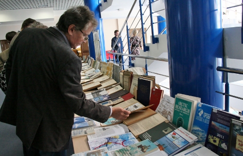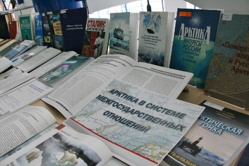 Прямо в зале разместилась выставка книг, посвященных освоению Арктики.