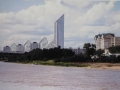 Первоначально проект застройки этого участка набережной от архитекторов Владимира Паровышника и Алексея Чиркина (архитектурная мастерская «Градъ») обсуждался на архитектурном совете еще в 2009 году. Замысел был насколько красивым, настолько и ужасным для жителей существующих домов – вид на Иртыш им должны были заслонить три 71-метровых пирамиды-близнеца, из которых ближайшая к метромосту увенчалась бы еще и башней в 140 метров. Проект назвали смелым и высокопрофессиональным, но крайне трудно реализуемым и не только из-за его размаха. Дело в том, что, по информации «Омскриэлта», три площадки на этой земле были отведены трем разным инвесторам – ЗАО «Группа компаний «Стройинвест» Романа Лося, компании президента омского Союза строителей Николая Лицкевича и московской ГК «Корстон» (под пресловутый отель «Орленок»).