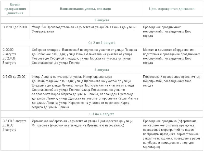 Мэр Вячеслав Двораковский подписал «План прекращения движения транспорта», согласно которому в дни празднования 298-летия Омска будут закрыты для всех видов транспорта несколько улиц. Для автолюбителей мэрия подготовила таблицу, где сообщается, в какое время какие улицы перекроют.