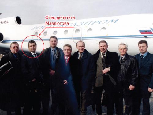 Отец депутата Мавлютова в окружении сотрудников «Сибнефти». Снимок сделан в аэропорту на фоне самолета «Аэрофлота» перед очередной деловой поездкой.