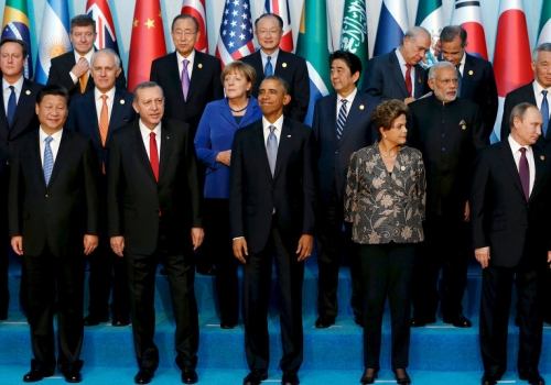 Президент США Барак Обама, канцлер Германии Ангела Меркель, британский премьер Дэвид Кэмерон, итальянский — Маттео Ренци и министр иностранных дел Франции Лоран Фабиус провели короткую встречу ближе к концу саммита G20.